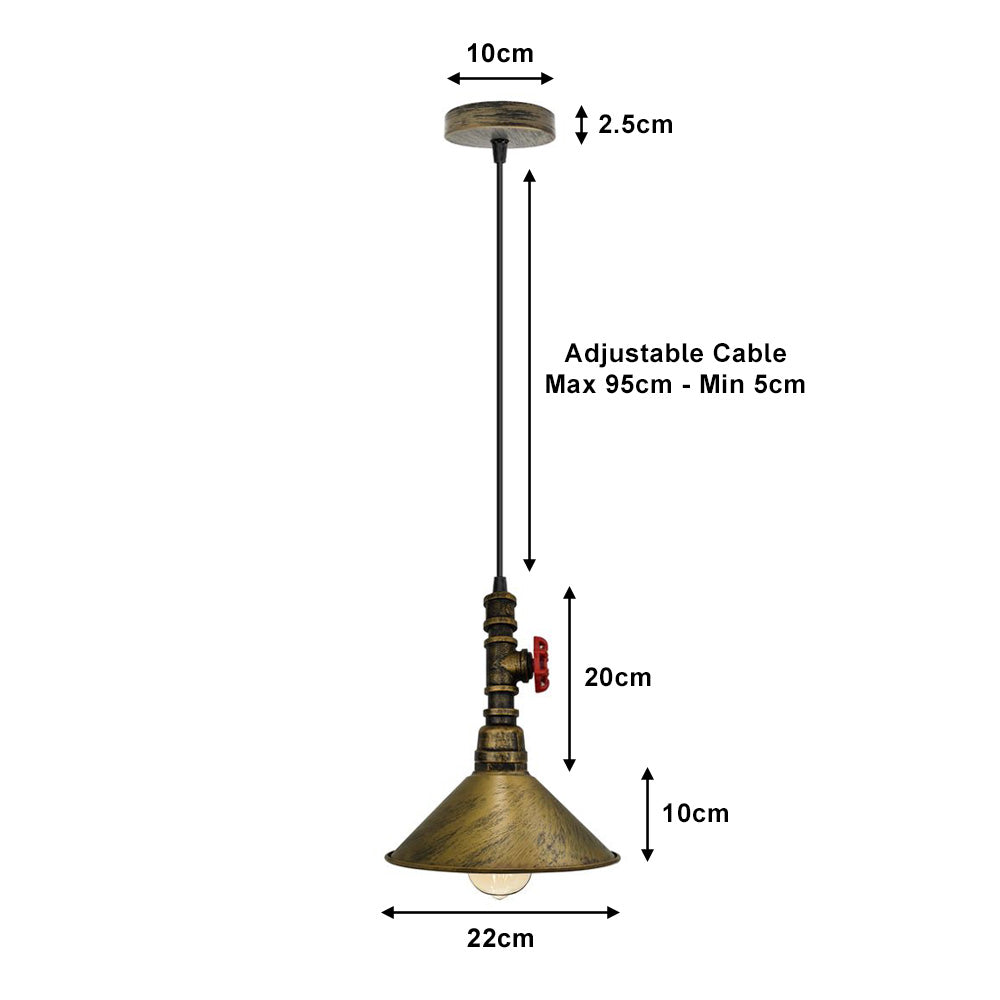 Introduce a touch of classic elegance to your décor with our Brushed Brass Pipe Steampunk Pendant Light. Crafted with a timeless waterpipe design, this fixture is finished in a luxurious brushed brass and features a decorative red water valve enhancing its vintage appeal. The cone-shaped light shade directs the lighting downwards, creating a warm, diffuse ambiance that highlights the intricate metallic sheen. Perfect for adding a blend of old-world charm and modern functionality to any space, this pendant light also features a 95cm adjustable cable for versatile installation.