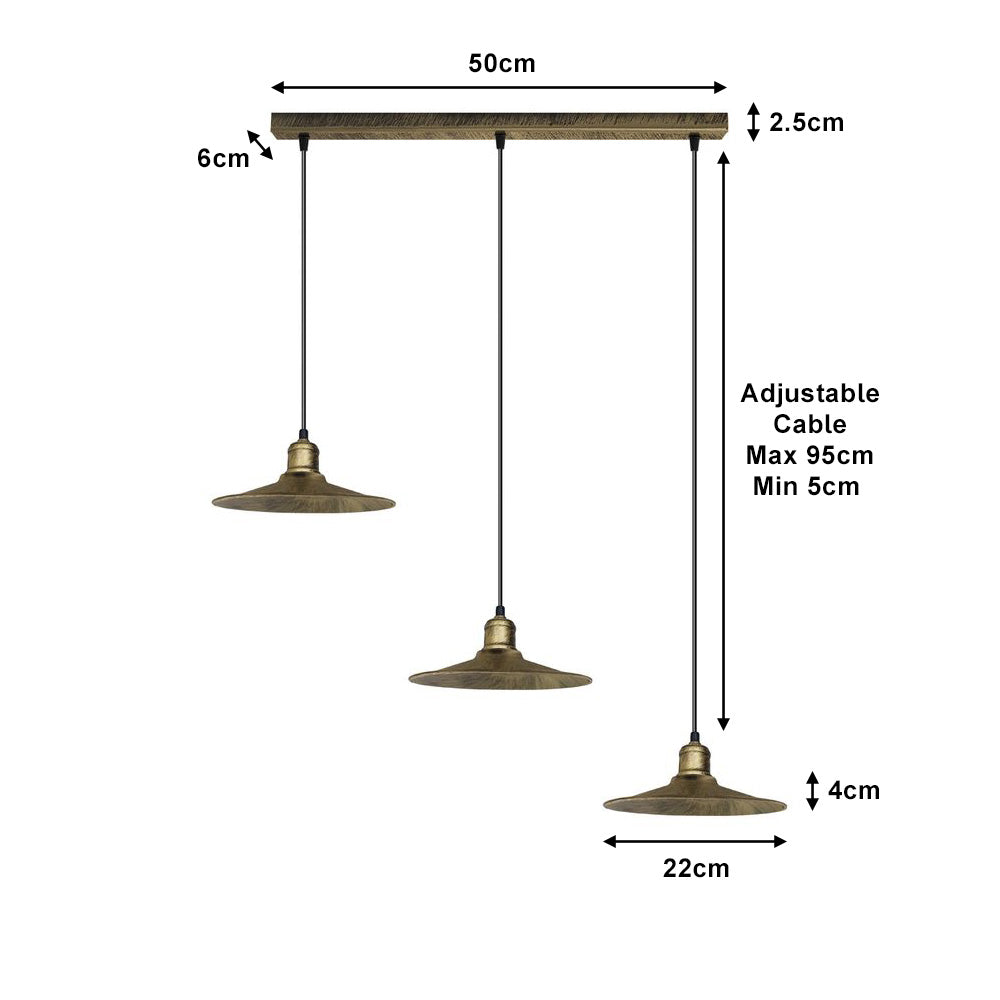 Enhance your home with the sleek and sophisticated Brushed Brass Vintage 3 Light Pendant. Featuring a linear bar design, this pendant light aligns three elegant flat cone shades in brushed brass along a single axis, providing balanced illumination perfect for long dining tables or kitchen islands. Each light is adjustable, allowing for customized positioning to create the ideal lighting ambiance. The cohesive brushed brass finish extends throughout the fixture, from the shades to the ceiling plate, offering a streamlined look that complements both contemporary and traditional decors.