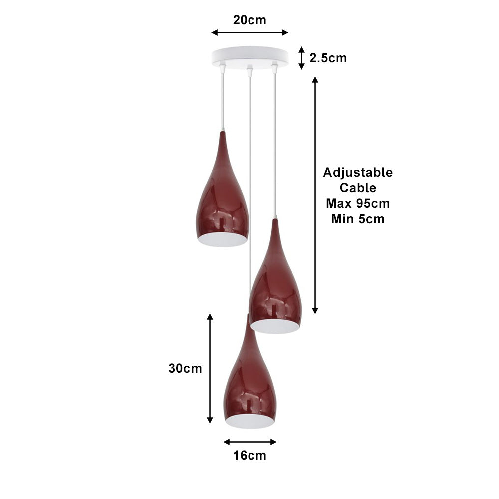 Illuminate your space with the sophisticated elegance of the Burgundy Triple Teardrop Pendant Light. This exquisite lighting fixture features three teardrop-shaped shades, each rendered in a rich burgundy finish complemented by white interiors to maximize light reflection. Adjustable 95cm white cables and a colour-coordinated ceiling plate allow for tailored hanging heights, making this pendant an ideal choice for dining rooms, entryways, or any area in need of a modern touch with a classic colour influence. The unique colour scheme adds a vibrant yet elegant touch to any décor, perfect for those looking to enhance their home with distinctive and stylish lighting solutions.