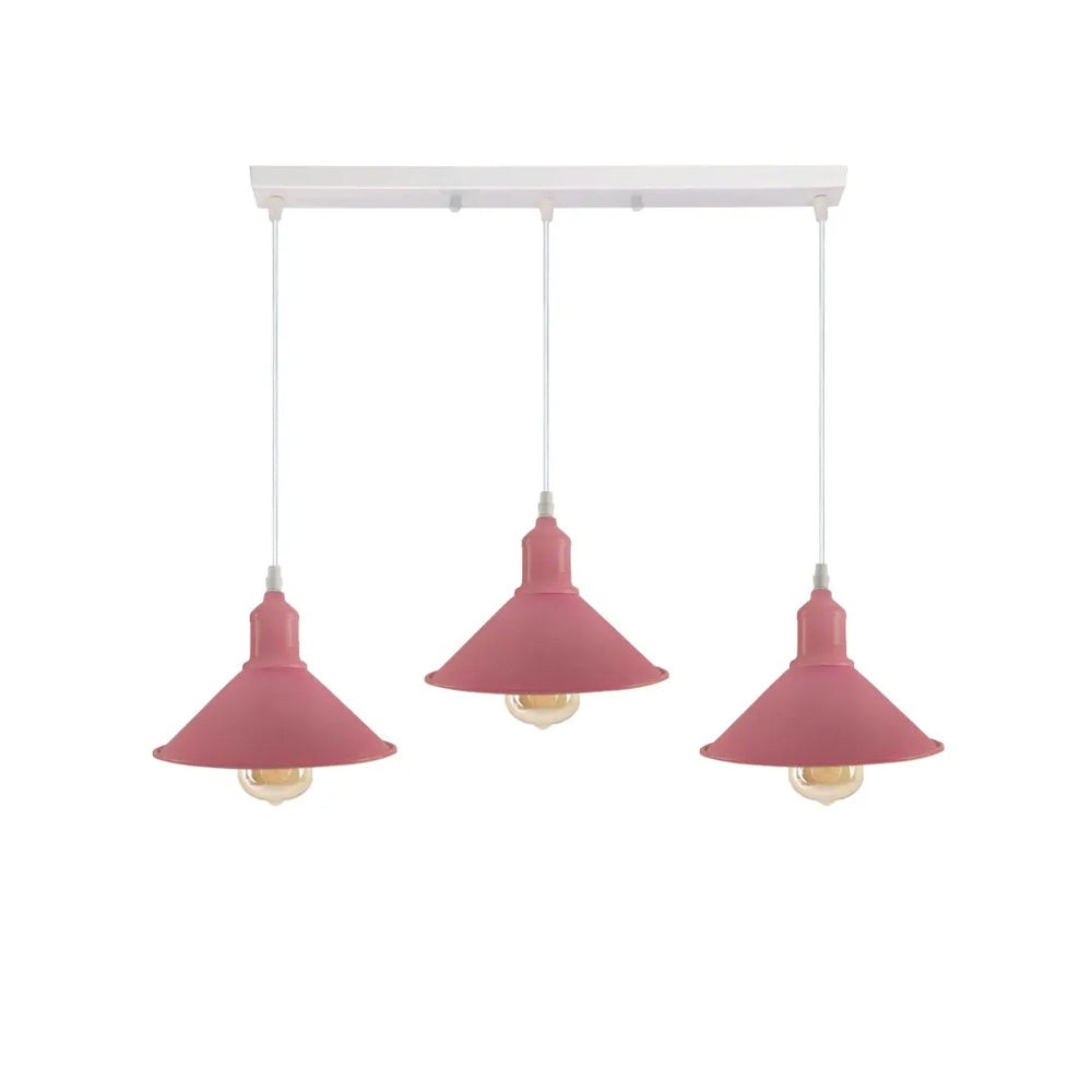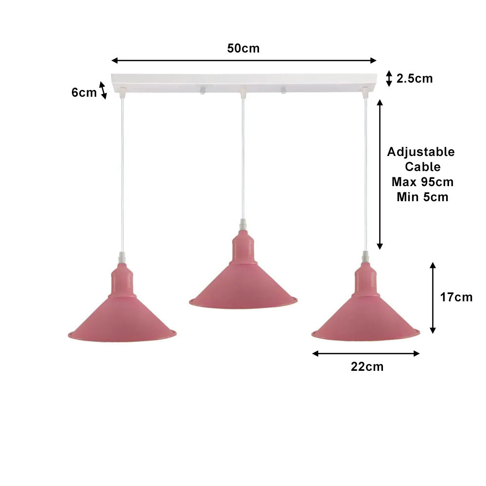 Introduce streamlined sophistication to your space with the Cone Industrial Style 3 Light Pendant. This fixture showcases a linear arrangement of three cone-shaped shades, each reflecting an elegant industrial aesthetic. Designed to complement a range of interiors, this pendant is available in a vibrant palette of colours including pink, yellow, red, orange, blue, grey, burgundy, white, and green, with each shade featuring a lamp holder that perfectly matches the colour for a cohesive look. The 95cm adjustable cables allow for custom fitting over kitchen islands, dining tables, or workstations, making it versatile for both residential and commercial settings. Ideal for those seeking a modern touch with industrial flair, this pendant light enhances any décor with its clean lines and chic design.