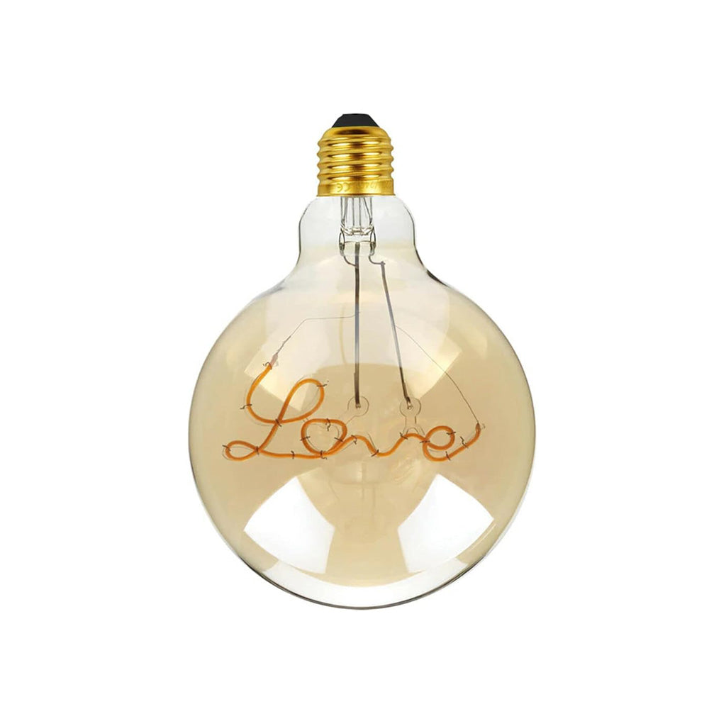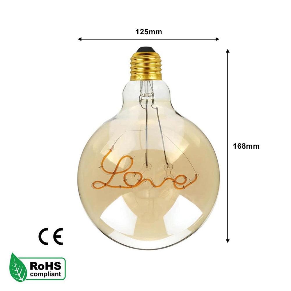 Introducing the G125 E27 4W Edison Dimmable LED Bulb, a statement piece with a unique "Love" filament design set within vintage amber glass. Emitting a warm white light, this bulb creates a soothing atmosphere, perfect for settings that require a touch of romance and warmth. Its dimmable feature allows you to adjust the lighting to suit any mood or occasion, making it a versatile choice for both daily use and special events. With the energy efficiency of LED technology, this bulb combines the charm of classic Edison style with modern functionality, ensuring both longevity and cost savings.