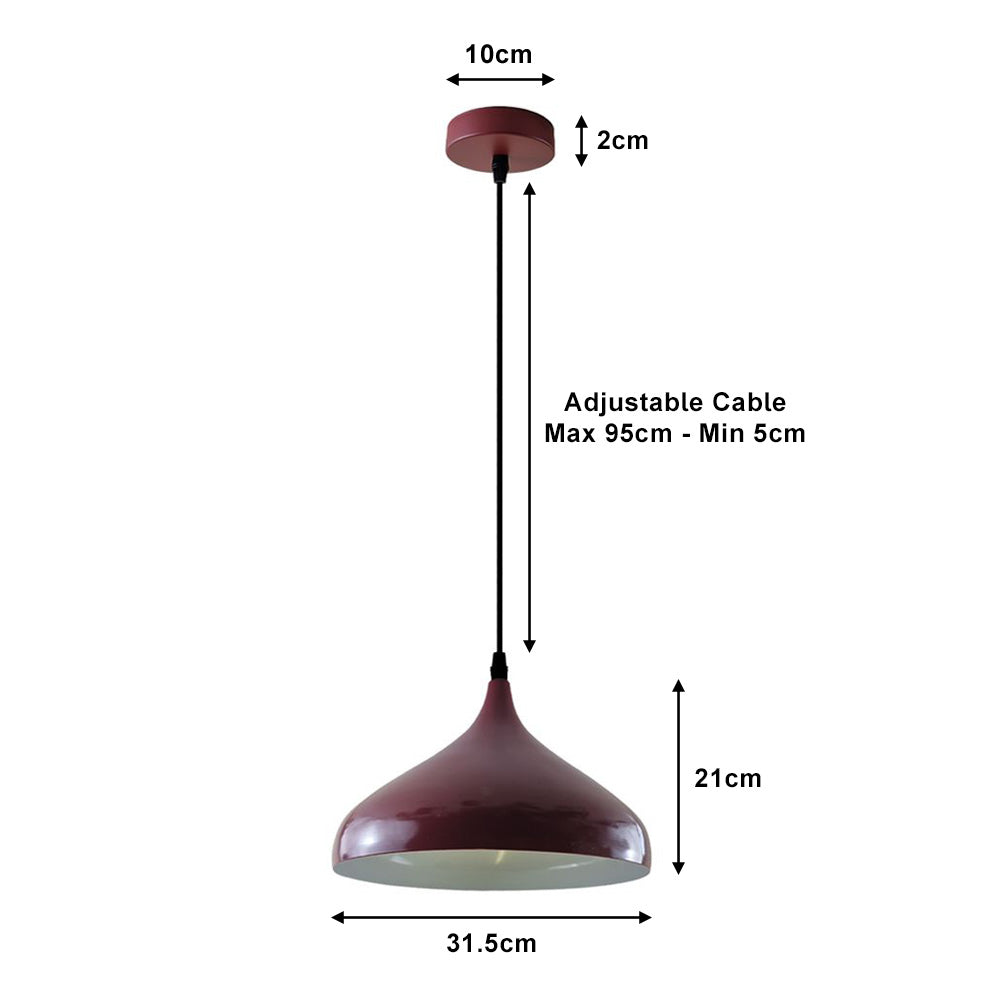 Introduce a touch of refined elegance to your space with the Burgundy Teardrop Pendant Light. This striking fixture features a wide teardrop-shaped shade, beautifully finished in a deep burgundy with a contrasting white interior to enhance light reflection. The black 95cm adjustable cable allows for optimal positioning, making it perfect for varying ceiling heights, while the matching burgundy ceiling plate seamlessly ties the design together. Ideal for adding a warm, inviting glow to dining areas, living rooms, or entryways, this pendant light embodies sophistication and style.